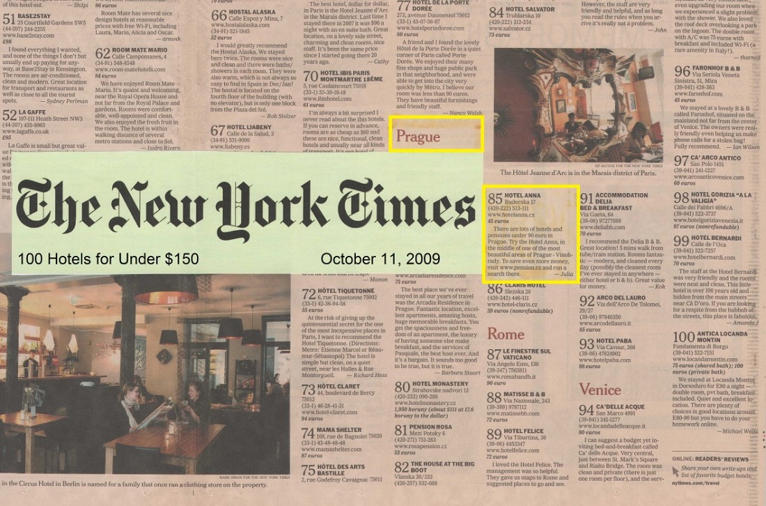 - Anna Hotel has been recognized by readers of the New York times as one of Europe’s 100 best hotels priced under USD 150.00.