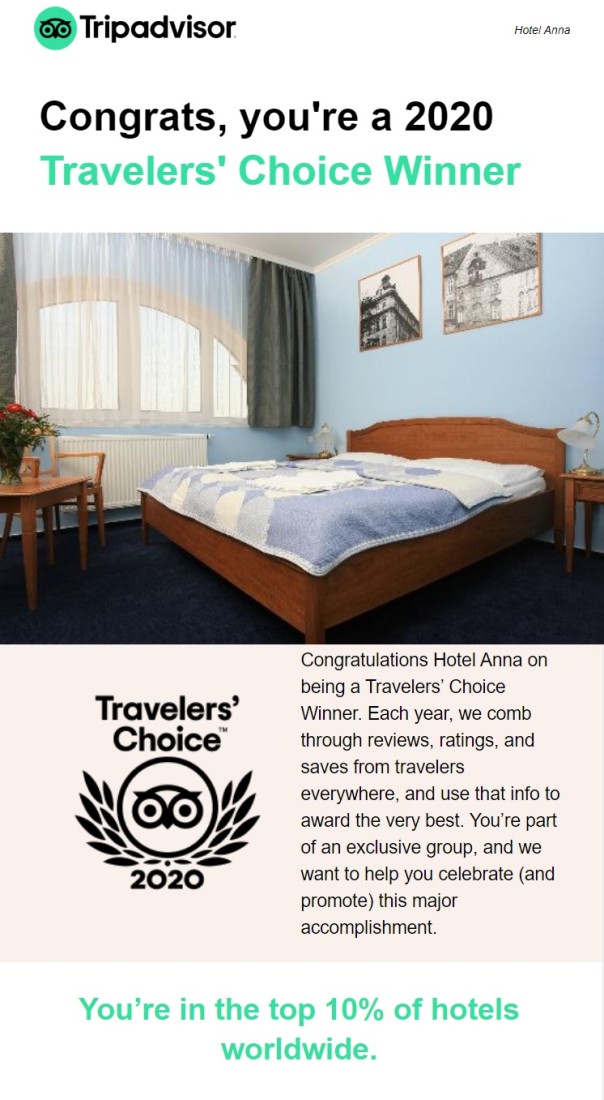 - Anna Hotel has been awarded by users of the traveler portal TripAdvisor as Travelers’ Choice Winner